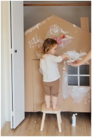 Child painting a cardboard house indoors with crea