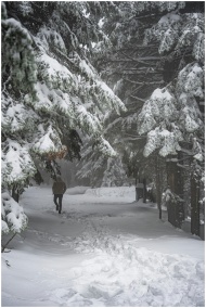 A lone figure walks through snow-covered trees in