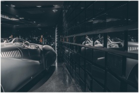 A vintage car displayed in a modern glass-walled showroom in Munich, Germany.