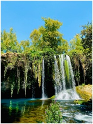 Vibrant waterfall surrounded by greenery under a clear blue sky, perfect nature retreat.