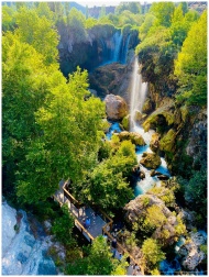 A breathtaking waterfall cascades through a lush green canyon, creating a serene landscape.