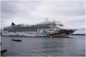 The Norwegian Gem cruise ship docked at a port with artistic exterior design and calm waters.