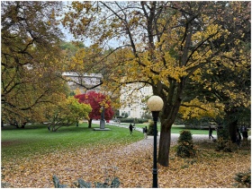 Serene autumn park scene with colorful foliage and visitors strolling through lush greenery.