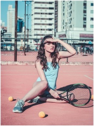 Young woman sitting on tennis court with racket and balls, sunny day.