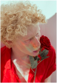 Artistic portrait of a person with curly blonde hair holding a red rose, captured in soft natural light.