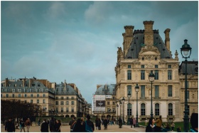 A view of the Louvre Museum's ornate architecture in Paris, bustling with visitors.