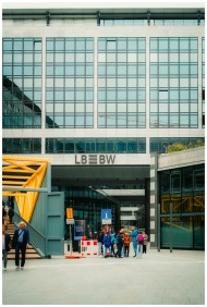 Symmetrical view of modern buildings framing a dis