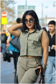 Confident woman in sunglasses poses stylishly on a bustling city street.