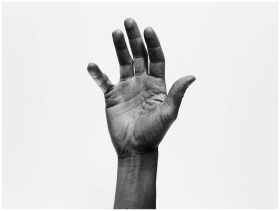 A high-contrast black and white image showcasing the intricate details of an outstretched hand.