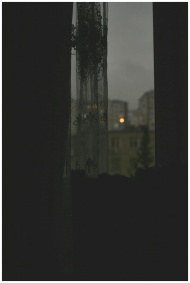 A moody cityscape is seen through delicate lace curtains at dusk, capturing an urban atmosphere.