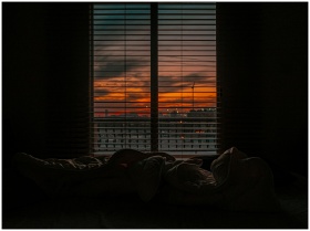 Cozy bedroom with a view of a vibrant sunset through window blinds.