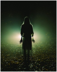 A silhouette of a woman stands eerily in a misty f