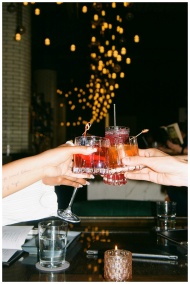 Friends raise colorful cocktails in a vibrant bar setting, celebrating casually.