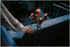 A mysterious hand reaches towards a burning candelabra on a dimly lit balcony, evoking a gothic atmosphere.