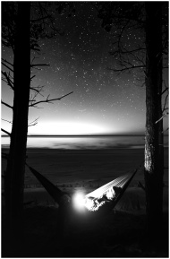 A peaceful scene of a hammock under a starry sky a