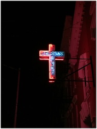 A glowing neon cross sign that reads 'Jesus Saves' against a dark night sky.