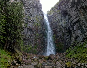 Breathtaking waterfall cascading through rocky cliffs at Skuleskogen National Park, Sweden.