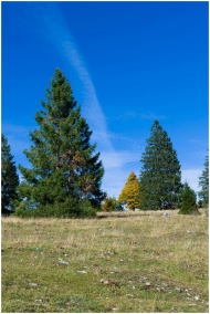 Serene landscape featuring evergreen trees and autumn foliage under a clear blue sky.