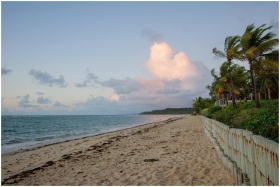 Tranquil beach view at sunset in Porto Seguro, Bahia, Brazil, with lush palm trees and gentle waves.