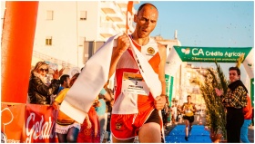 Male runner crosses finish line triumphantly in vi