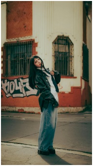 Trendy woman in black jacket posing against graffiti wall in an urban setting, showcasing contemporary fashion style.