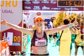 A joyous woman celebrates crossing the marathon finish line with arms raised in victory.
