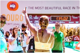 Runner celebrates at marathon finish line, surrounded by cheering audience and vibrant energy.