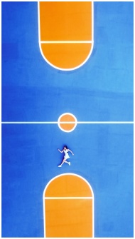 Top-down shot of a woman lying on a colorful outdoor basketball court.
