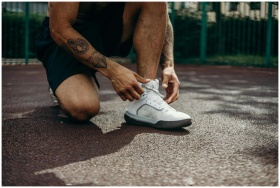 Close-up of a person kneeling and tying white sneakers on a sports ground.