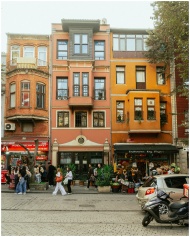Lively street with colorful architecture, shops, and people in an urban setting.
