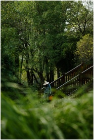A person with a hat walking along a peaceful fores