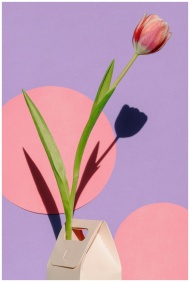 Artistic photo of a tulip in a modern paper vase against vibrant geometric shapes.