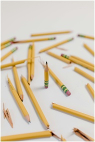 A creatively arranged set of broken and whole yellow pencils on a white background, emphasizing selective focus.