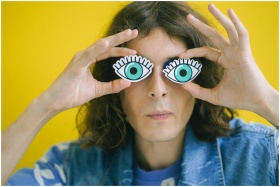 Man holding cartoon eye masks over face, playful and vibrant portrait on yellow backdrop.