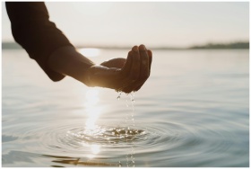 Close-up of a hand holding water with sunlight reflecting on the water surface.