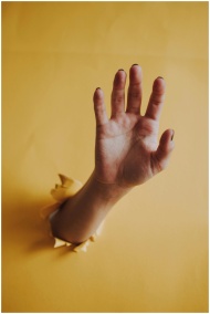 A hand breaks through yellow paper, offering a striking visual contrast.