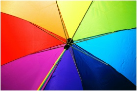 A close-up of a colorful rainbow umbrella showcasi