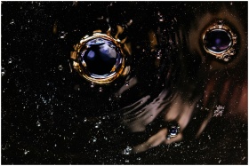 Close-up view of bubbles and droplets creating an abstract pattern on a dark liquid surface.