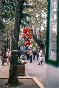 Charming street scene with colorful balloons and people enjoying a stroll. Perfect stock photo for lively urban themes.
