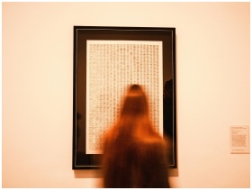 A blurred figure views artwork in a London museum,