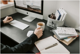 Man sipping coffee at a modern workspace with computer and notebooks.