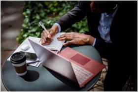 From above of crop black male journalist in formal wear writing article while sitting at table with red laptop and cup of takeaway coffee