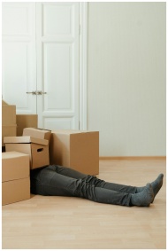 Man lying tired under cardboard boxes in an empty room, symbolizing moving stress.