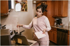 Woman multitasking in her kitchen with a laptop and notebook, cooking and working from home.