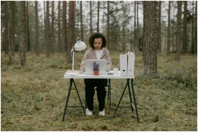A woman sits at a desk in a forest, working remotely on a laptop amidst nature.