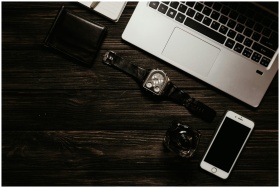 Minimalist flat lay of a laptop, smartphone, and accessories on a wooden surface.
