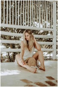 A serene outdoor photoshoot featuring a smiling blonde woman sitting against a rustic backdrop.