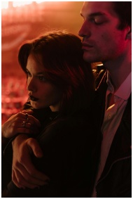 A romantic couple stands closely embraced in warm, ambient lighting, reflecting intimate connection and love.