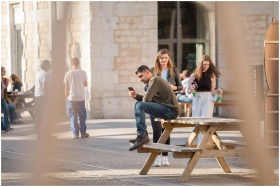 Group of friends enjoying leisure time at an outdoor cafe in Bordeaux.