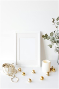 Composition of empty white photo frame placed on white table near decorative baubles candle and lush houseplant